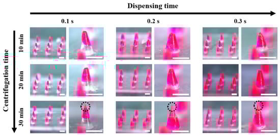 In the HMP-DMN fabrication method, the centrifugation step is important to fill the cavity of the entire mold with the PLGA mixture and HA. The effect of centrifugation time (10, 20, and 30 min), at the same centrifugation force of 3470× g, on the shape of the HMP-DMNs was evaluated at three different dispensing times with different amounts of PLGA mixture. The centrifugal force is the same regardless of the centrifugation time; however, the change in momentum is different depending on the centrifugation time, which means that the movement of HA in the mold is different depending on the centrifugation time.