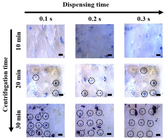 As shown in Figure 4, HMP-DMNs fabricated with a centrifugation time of 10 min made no stained perforation, while the HMP-DMNs fabricated with a centrifugation time of 20 min penetrated 3.3 ± 0.7 of the 9 holes (n = 3, mean ± SEM) on the porcine skin. The HMP-DMN patch, which had a stubby tip due to insufficient centrifugation time, did not penetrate the porcine skin. In contrast, the HMP-DMN patches fabricated with a centrifugation time of 30 min were able to make 3 × 3 arrays of stained perforations on the porcine skin (Figure 4; dotted black circles), regardless of the dispensing time. This confirms that the HMP-DMN patch group fabricated with a centrifugation time of 30 min had sufficient time to make sharp tips for all the microneedles in the 3 × 3 arrays by filling the tip area in the mold with the HA solution, unlike the groups that were fabricated with centrifugation times of 10 and 20 min.