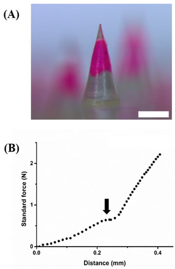 The mechanical properties of the HMP-DMNs were evaluated using a force analyzer (Z0.5TN, Zwick Roell Inc., Ulm, Germany). A single HMP-DMN was placed on the test stage positioned vertically, while a metal probe moved vertically downward at a continuous speed of 3.6 mm/min. The initial distance between the probe and stage was 1.5 mm. After the probe reached the tip of the HMP-DMN, the force was gradually increased 0.02 N/s up to a maximum force of 5 N. When a fracture occurred in the HMP-DMN, the fracture force was recorded.