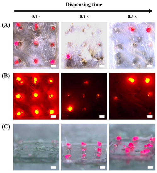 Two casting solutions were used as the backbone to make the HMP-DMNs. The first solution was prepared by mixing PLGA and Rho B for sustained release. The second HA (30 kDa, PrimalHyal50; Soliance, Pomacle, France) solution of 60% (w/v) was prepared using a planetary centrifugal mixer (ARV-310, Thinky Corp., Tokyo, Japan) at 5000 rpm for 30 min. HA was selected based on a biodegradable, biocompatible, and viscous nature [27]. The PLGA and Rho B solution, which was heated using a temperature control unit to 100 °C to maintain the liquid state, was dispensed as an array of 3 × 3 droplets into the cavity of the mold using a robotic dispenser (SHOT mini 100S, Musashi Engineering Inc.). This dispensing process was performed with three different dispensing amounts of PLGA mixtures, which were controlled by altering the dispensing times, 0.1, 0.2, and 0.3 s, at a pressure of 250 kPa. After dispensing the PLGA mixtures, HA solution was added into the mold and centrifuged for three different centrifugation times (10, 20, and 30 min) at 3470× g [28]. Images of the fabricated HMP-DMNs were acquired using a stereomicroscope (M165FC, Leica Camera AG, Wetzlar, Germany) and a digital microscope camera (DFC450C, Leica Camera AG).