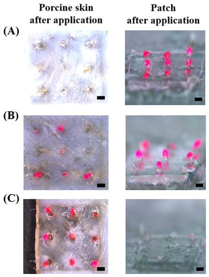 To evaluate the separation time of the HMP-DMN patch with a dispensing time of 0.1 s, separation analysis was performed at different application times. The HMP-DMN patch was pressed by thumb force into pig cadaver skin and then detached from the skin after 0, 5, and 10 min, because HA has been shown to completely dissolve 10 min after skin insertion [35]. As shown in Figure 7A, none of the HMP-DMNs separated from the patch, and HMP-DMN remained on the patch when it was immediately detached after application (0 min of the application group). After 5 min, two of the HMP-DMNs from the 3 × 3 array were found to have been entirely inserted into the skin (Figure 7B), because every needle in the array had a base area composed of HA of different heights. However, at 10 min, all the HMP-DMNs from the 3 × 3 arrays were found to have fully separated from the patch, with no residuals remaining on the patch (Figure 7C). This means that the patients would have to wear the HMP-DMN patch for just 10 min after insertion, after which the patch can be detached, and the PLGA mixture will keep releasing therapeutics below the skin without the patch. In view of this result, this system can possibly overcome the limitations of traditionally implanted DMNs, and thus, can improve patient compliance without attaching problems. Further studies focused on skin pore closure after DMN penetration and complete implantation of DMN should also be conducted to achieve the successful utilization of HMP-DMN technology [43,44].