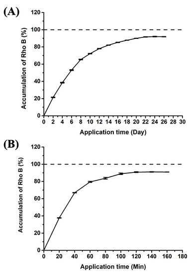 To estimate the release profile of Rho B from the HMP-DMN patch, phosphate-buffered saline (PBS, pH 7.4; Life Technologies, Carlsbad, CA, USA) containing 25% (v/v) ethanol was used as the releasing medium [29]. The HMP-DMN patch was fabricated, and the amount of Rho B encapsulated in the 3 × 3 arrays of the HMP-DMN was calculated using the following formula: