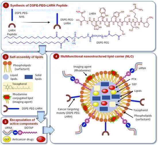 Schematic representation of cancer cell targeted multifunctional and multicomponent nanostructured lipid carrier (NLC). The scheme shows the design and four stages of preparation of the delivery system containing anticancer drugs (gefitinib, GEF, and/or paclitaxel, PTX), imaging agent (rhodamine), targeting moiety (DSPE-PEG-LHRH), and conjugated siRNA targeted to EGF receptors.