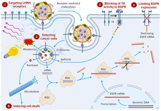 In the current work, we address the above-mentioned important problems by substantially enhancing the efficiency of therapy and reducing its adverse side effects. Here, we have designed stable multifunctional nanostructured lipid carriers (NLCs) comprised of a PEG-coated surface that was conjugated with an LHRH analog as a targeting moiety for the specific delivery of anticancer therapeutics to NSCLC. Such NLCs were used for the delivery of the anticancer drug paclitaxel (PTX), the EGFR TK inhibitor gefitinib (GEF), a cancer cell-targeting moiety (LHRH), an imaging agent (rhodamine), and siRNA targeted to mRNA encoding EGF receptors. Cancer-targeted theranostic multicomponent and multifunctional NLCs were designed to simultaneously solve several different but closely related tasks: (1) detect cancer cells by targeting them with the LHRH peptide and visualizing them with the help of an imaging agent containing fluorescent dye; (2) protect, increase water solubility, and enhance the cellular internalization of active components by PEGylated stabilized lipid-based carries (NLCs); (3) induce cell death by the anticancer drug (PTX); (4) decrease the expression of EGF receptors by EGFR-targeted siRNA; and (5) inhibit EGFR TK by GEF. The experimental data obtained show that this complex multifunctional system possesses significantly enhanced anticancer activity that cannot be achieved by individual components applied separately.