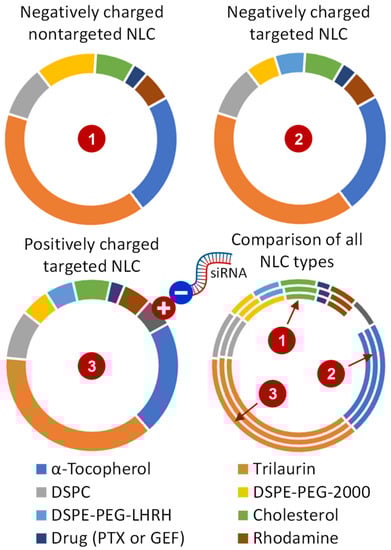 The lipid composition of prepared NLCs was very similar in all synthetized types of delivery systems. The differences were between cancer-targeted and non-targeted systems and between negatively and positively charged ones. In cancer-targeted systems, approximately one-half of the DSPE–PEG surfactant was substituted for DSPE–PEG–LHRH, providing LHRH as a targeting moiety/ligand to LHRH receptors overexpressed in cancer cells and almost not expressed in normal cells in visceral organs [55,58]. This creates prerequisites for the specific delivery of cancer-targeted NLCs predominately to cancer cells and limiting adverse side effects upon healthy cells, tissues, and organs [21,58]. On the other hand, positively charged NLCs additionally contained around 5% of DOTAP for creating cationic NLCs, allowing a strong conjugation with anionic (at physiological pH) siRNA. It should be stressed that such a conjugation dramatically decreased the total positive charge of NLC–siRNA complexes for the safe +10–20 mV that does not induce negative effects on normal cells and tissues [80].