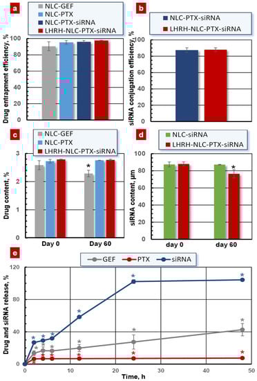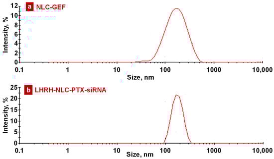 As shown in Figure 6a, the entrapment efficiency of drugs gefitinib and paclitaxel was 90.54 ± 5.48% and 97.60 ± 0.34% for the NLC–GEF and LHRH–NLC–PTX–siRNA, respectively.