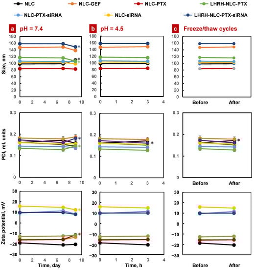 Stability of different NLC formulations in various storage conditions: (a) Aqueous solution with normal pH; (b) Aqueous solution with low pH; (c) Three freeze–thaw cycles (one freeze cycle represents 12 h storage at −20 °C and one thaw cycle represents 12 h storage at room temperature). Means ± SD are shown (note that in most cases, SD values are too small to be seen on the figure). * p < 0.05 when compared with the day 0.