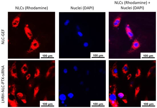 In order to visualize NLCs in the cells, we labeled NLC by fluorophore rhodamine. A549 cells were incubated with rhodamine-labeled NLC formulations for 24 h and stained with DAPI for nuclei visualization. The data showed that the rhodamine-labeled NLCs containing anticancer drug and siRNA successfully penetrated into the cells and localized in the cytoplasm—indicating cellular uptake of nanoparticles (Figure 7). Our previous investigations showed that siRNA delivered by the similar NLCs were efficiently taken by cancer cells [23]. Our current data show that the delivered siRNA reduced the expression of targeted mRNA (Figure 8) and enhanced the toxicity of the entire NLC complex (Figure 9). These findings confirm the efficient cellular internalization of siRNA after the delivery by the developed NLCs and the preservation of siRNA-specific activity during its conjugation with NLCs, the delivery, and internalization by cancer cells.