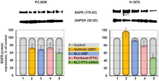 Protein expression was studied using Western blot analysis of lysate samples of PC-9GR cells and H-1975 cells to probe the effect of NLC drug formulations on the expression of EGFR protein. PC-9GR cells possess intrinsic resistance to gefitinib, while H-1975 cells harbored the L858R and T790M mutations in the EGFR kinase domain [76]. We found that naked non-bound siRNA was practically not toxic for all studied lung cancer cells (IC50 dose could not be measured for all available concentrations of free siRNA). Moreover, in our previous experiments, we showed that naked siRNA did not penetrate cancer cells and did not influence the expression of a targeted gene [77]. Therefore, we did not include naked siRNA in our Western blotting experiments. Our data show that both non-bounded free and delivered with NLCs GEF decreased the expression of EGFR protein on about 20% in gefitinib-resistant PC-9GR cells (Figure 8). In contrast, free GEF was completely ineffective in human NSCLC H-1975 that express mutated EGFR protein. Moreover, the expression of EGF receptors increased in around 20% after the treatment with free GEF. The delivery of GEF by NLCs prevented such overexpression. The simultaneous delivery of PTX and siRNA targeted to EGFR mRNA further suppressed the expression of EGFR protein up to 40–50% in both types of NSCLC cells (Figure 8).