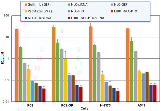 The anticancer efficiency of all studied NLC formulations were assessed by a MTT cell viability assay against various non-small cell human lung cancer A549, H-1975, PC-9, and PC-9GR cells. The percentage of live cells in a drug/NLC-treated sample was calculated by considering the absorbance of the vehicle-treated sample as 100%. Cytotoxicity (IC50 values) of GEF, PTX, and their NLC formulations in different NSCLC cells were summarized in Figure 9. GEF and PTX delivered by nanoparticles killed cancer cells much more effectively when compared with free non-bound drugs. Paclitaxel-loaded NLCs more effectively killed all studied cancer cells as compared to that of the gefitinib-loaded NLCs. The highest anticancer efficacy was found in all cells treated with the NLC–GEF and LHRH–NLC–PTX–siRNA (5 to 10-fold).