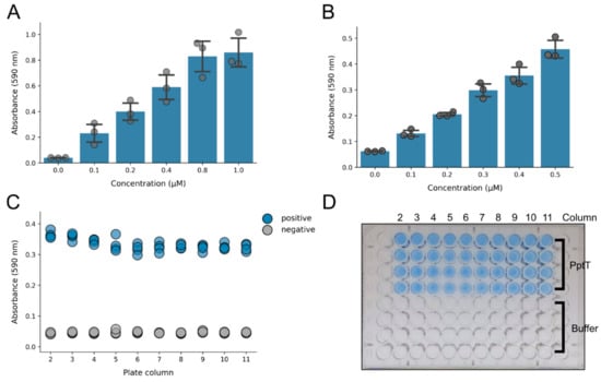 In our previous demonstration that BpsA could be used to quantify the strength of PPTase inhibition by the broad-specificity PPTase inhibitor 6-nitroso-1,2-benzopyrone, we monitored the change in velocity of indigoidine synthesis via continuous kinetic measurements [22]. We have since developed BpsA as a biosensor to measure glutamine [25] and ATP [31] and in so doing observed that end-point measurements post-solubilisation of the total indigoidine in 80% DMSO yielded more consistent data. To implement a similar approach here to quantify inhibition of PptT, we first assayed pre-activated holo-BpsA at a concentration range from 0 to 1 µM in 50 µL reactions. This enabled us to identify 0.6 µM BpsA as an enzyme concentration that could provide a robust signal within the linear range of the assay, in a volume that could accommodate the addition of DMSO to 80% (v/v) without exceeding the well capacity of a standard 96-well plate (Figure 2A). We then identified 0.4 µM PptT as a suitable concentration of target PPTase that, in the absence of inhibitor, induced a strong indigoidine synthesis signal when co-incubated with 0.6 µM apo-BpsA (Figure 2B).