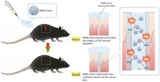 One of the limitations of wound healing is the overproduction of reactive oxygen species (ROS) at wound sites that may inhibit the repair process by triggering harmful reactions such as cellular senescence, fibrotic scarring, and inflammation [,]. Therefore, ROS-modulating agents with the ability to reduce oxidative damage at injured sites become a promising alternative for wound repair and regeneration process. Wu et al. used ceria nanocrystal-decorated MSNs (MSN-Ceria) as a ROS-scavenging tissue adhesive nanocomposite in wound healing, owing to the combination of MSN’s unique adhesion property and the ROS-reducing capacity of Ceria nanocrystals. After applying onto the wound, the MSN-Ceria initially holds the edges of the wound together and then attenuates the generation of oxidative stress at the injury site (Figure 5). Collectively, MSN-Ceria carries both strong adhesion strength and remarkable ROS-scavenging potential, leading to accelerated skin wound healing [].