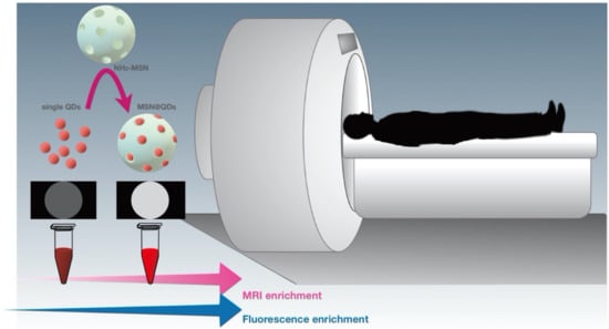 Additionally, the fluorescent properties of quantum dots (QDs) have been extensively explored for bioimaging [,]. The fluorescence wavelength shifts from blue to red as the particles’ size increasing, enabling QDs of the same material at different sizes to cover almost the complete visible color spectrum and to precisely control fluorescence properties. However, many CdSe/ZnS and ZnCdSe/ZnS (core/shell type) QDs are hydrophobic and MSNs have been used to improve their solubility in water. For example, QDs, ibuprofen drug, and magnetite nanocrystals simultaneously embedded into mesoporous silica spheres (M/GQD-MSS) exhibited superparamagnetic characteristics and water dispensability that are both desirable for their applications in drugs and genes delivery []. QDs and magnetic iron oxide nanocrystals loaded into MSNs have also been used to fabricate a dual-function probe that could be assigned for the magnetic capture, enrichment of biological targets, and simultaneously for optical encoding []. Furthermore, Hao et al. developed a novel microfluidic synthesis strategy with well-controlled physicochemical properties and used it for developing hollow spherical silica (HSS). The HSS was then assembled with different functional small-sized NPs, including QDs, silver nanoparticles, and magnetic nanoparticles, to simultaneously acquire specific magnetic, fluorescent, or catalytic properties []. This technology provides the intracellular and cell-specific delivery of imaging agents which are expected to contribute to clinical applications in the future.