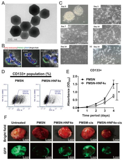 MSNs as effective nanocarriers for delivering specific genes to promote stem cell differentiation and cancer stem cell ablation. (A) Morphology of MSNs. (B) Time-dependent uptake of fluorescent MSNs by induced pluripotent stem cells. (C) Generation of functional dopaminergic neurons from induced pluripotent stem cells under pNurr-siRex1-FMSN treatment. (D) Flow cytometry indicated the decrease in CD133+ cell population of Huh7 cells treated with PMSN-HNF4α. (E) MTT assay showed that PMSN-HNF4α treatment significantly decreased CD133+ cell population of Huh7 cells. * p < 0.05 (F) Bright field and fluorescent images, showing the synergistic effect of HNF4α and cisplatin co-delivered by PMSN on hepatocellular carcinoma-bearing mice.