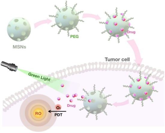 MSNs in the application of anti-cancer PDT. PEG-modified MSNs deliver photosensitizers into tumor cells and trigger their release upon the irradiation of green light, leading to the generation of reactive oxygen and cancer ablation.