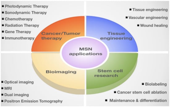 Update of MSN applications in nanomedicines. We conducted a literature review and summarized the latest publications regarding MSN applications in tissue engineering, bioimaging, stem cell research, and anti-cancer/tumor therapy.