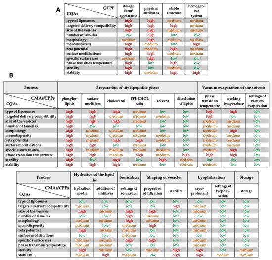 The nomination of a factor as a CQA, CMA or CPP always depends on the predefined goals, the expected quality of the product, the therapeutic needs and the selected production process. The stability, the zeta potential, the size of the vesicles, the number of lamellas, the polydispersity index, the surface modifications (in this study: PEGylation) and the phase transition temperature were identified as the CQAs, and the following factors were enumerated in the CMAs/CPPs group: the quality of the phospholipids and the cholesterol derivatives, the ratio between the phospholipids and the cholesterol, the surface modifiers, the phase transition temperature of the lipids, the quality of the solvent, the hydration media and the cryoprotectants, the working temperature and the process settings