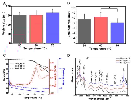 Characteristic features of the liposome samples prepared at different temperature values (50, 60 and 70 °C) from PC-CH 60:40 mass ratio composition, and hydrated with saline solution, presenting the results of the investigations: vesicle size and zeta potential analysis (A,B), differential scanning calorimetry and thermogravimetric analysis (C) and Fourier-transform infrared spectroscopy (D). *: p < 0.05.