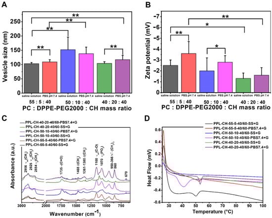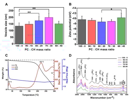 Characteristic features of the liposome samples prepared from different ratios of phosphatidylcholine (PC) and cholesterol (CH) at 60 °C, and hydrated with saline solution, presenting the results of the investigations: vesicle size and zeta potential analysis (A,B), differential scanning calorimetry and thermogravimetric analysis (C) and Fourier-transform infrared spectroscopy (D). *: p <0.05; **: p < 0.01.