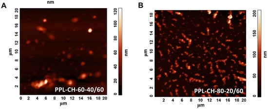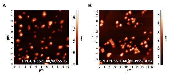 Figure 6 illustrates the AFM images of the PPL-CH-60-40/60 (Figure 6A) and PPL-CH-80-20/60 (Figure 6B) samples proving homogeneous size distribution and 120–150 nm of mean vesicle size consistently with the DLS results.
