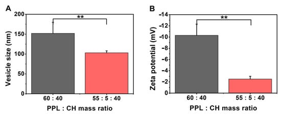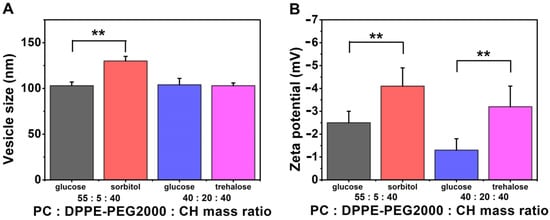The samples were made at 60 °C and hydrated with different media (saline solution and PBS pH 7.4) to study the effect of using different concentrations of PEGylated phosphatidylethanolamine. A non-linear relationship can be detected between the phospholipid ratios and the vesicle size (Table 9, Figure 7). The increase in the concentration of the PEGylated phospholipid from 55:5:40 mass ratio meant first larger vesicles (50:10:40 mass ratio), then a decrease in the size (40:20:40 mass ratio). The significantly largest particle size was measured in the case of the formulations made with PC:DPPE-PEG-2000:cholesterol 55:10:40 mass ratio for both hydration media (saline solution: 152 ± 44 nm; PBS pH 7.4: 138 ± 23 nm) (**, p < 0.01) (Figure 6A,B). Increasing the amount of the PEGylated phospholipids to this certain ratio enlarges the size of the vesicles. However, further addition causes a sharp decrease in the mean size value due to the formation of PEGylated phospholipid-based micelles, as Garbuzenko et al. described for disteroylphosphoethanolamine (DSPE)–PEG2000-containing vesicles [49]. Our results show the same phenomenon for DPPE-PEG2000 as well. The polydispersity index was measured as the lowest in the 55:5:40 case (0.25 ± 0.05; 0.20 ± 0.02). Thus, this formulation is the best regarding the particle size and uniformity, providing vesicles around 100 nm with uniform size. Even the zeta potential values were significantly more negative in case of the 55:5:40 ratios (−2.5 ± 0.5 mV; −3.6 ± 1.1 mV) than of the 40:20:40 ones (saline solution: *, p < 0.05; PBS pH 7.4: **; p < 0.01). Although the zeta potential values were negative, the highest was the used proportion of the DPPE-PEG2000; the least negative was the measured zeta potential value. Using PBS pH 7.4 resulted in moderately larger and more negative liposomes than those hydrated with saline solution.