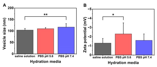 The effect of the quality of the hydration media on the PC-CH-PEG 40:20:40 mass ratio formulations made at 60 °C was studied (Table 11, Figure 9). The size of the particles increased in the order saline solution (104 ± 7 nm) < PBS pH 5.6 (110 ± 5 nm) < PBS pH 7.4 (117 ± 15 nm), with a significantly larger size in case of the PBS pH 7.4 than the saline solution (**, p < 0.01). The polydispersity of the formulations is mainly not influenced by the quality of the hydration media (0.29 ± 0.07; 0.33 ± 0.05; 0.26 ± 0.06), while a decrease could have been detected in the zeta potential values according to the following order: saline solution (−1.3 ± 0.5 mV) > PBS pH 7.4 (−1.6 ± 0.7 mV) > PBS pH 5.6 (−2.3 ± 1.2). Vesicles made with PBS pH 5.6 had significantly higher zeta potential than those hydrated with saline solution (*; p < 0.05). The ionic strength of the hydration media influences the value of the zeta potential; the higher the ionic strength is, the more compact the ion layer formed around the vesicles, and due to this phenomenon, the higher the zeta potential, as Tefas et al. described in their work [42]. In the presented case, the ionic strengths of the hydration media were: saline solution (0.15 M) < PBS pH 7.4 (0.16 M) < PBS pH 5.6 (0.40 M), which prove that the increasing ionic strength of the media increases the value of the zeta potential for the hydrated lipid vesicles. Therefore, not only its pH but also the ionic strength of the chosen solution should be determined for liposomal preparation.