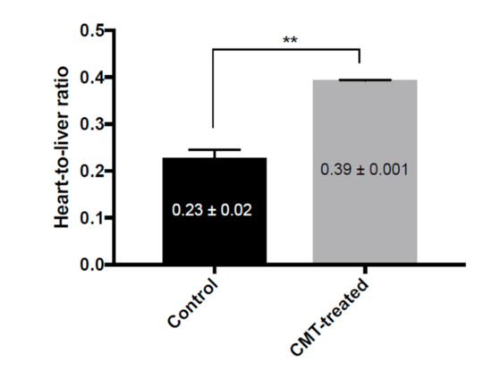 The ratio of 99mTc-TF uptake in the heart and the liver. The heart-to-liver ratio is calculated as: (radioactive count for the whole heart)/(radioactive count for the whole liver). ** p < 0.01 vs. control, Student’s t-test.