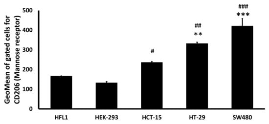 We evaluated the mannose receptor expression in colon cancer cell lines and compared it to normal cell lines. We used three colon cancer cell lines, SW480, HCT-15, HT-29, and two normal cell lines, HEK-293 and HFL1. The expression of the mannose receptor is determined based on the geometrical mean of 10,000 gated cells (two replicates per cell line). The two normal cell lines had a lower expression for mannose receptors compared to all colon cancer cell lines (Figure 1). Specifically, HCT-15 presented higher mannose receptor expression when compared to HEK-293 (p < 0.05) and HFL1, though it did not reach statistical significance for the latter. In contrast, HT-29 (p < 0.01) colon cancer cells and SW480 (p < 0.001) expressed mannose receptors significantly higher compared to either HEK-293 or HFL1.