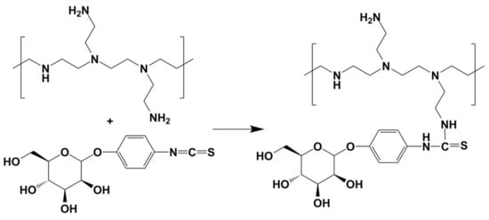 Reaction scheme for the synthesis of Man-PEI. PEI1800 reacted with α-D-Mannopyranosylphenyl isothiocyanate for 24 h to produce Mannosylated PEI. The product was purified through dialysis.