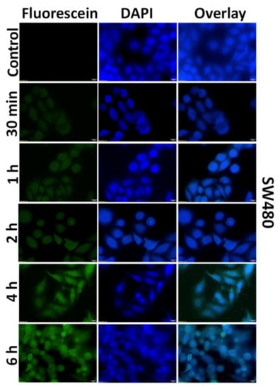 We used the fluorescein-tagged Man-PEI complexes to investigate the internalization of the complexes into two colon cancer cell lines, SW480 and HCT-15. Both cell lines were treated with the tagged polymer for different predetermined time periods, i.e., 30 min, 1, 2, 4, 6 h, and analyzed by either fluorescent microscopy or flow cytometry. As shown in Figure 5 for SW480 and Supplementary Figure S2 for HCT-15, we observed a time-dependent increase of the Man-PEI/plasmid complexes’ uptake in both cell lines. Fluorescein and DAPI channels were used to detect the complexes and the cell nuclei, respectively, using fluorescent microscopy. These results were quantitatively corroborated using flow cytometry (Figure 6a).