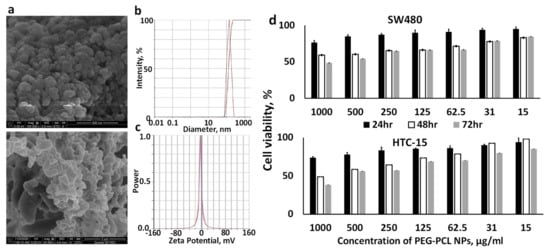 PEG-PCL NPs with encapsulated Man-PEI/plasmid complexes present nanosized spherical structures of relatively similar size and minimal toxicity. (a) Representative SEM imaging of the polymer nanocarriers; (b) Dynamic Light Scattering analysis of the nanoparticles; (c) Zeta-potential analysis of the nanocarriers; (d) Cytotoxicity analysis of PEG-PCL NPs with encapsulated Man-PEI/plasmid complexes in SW480 and HCT-15 cells.