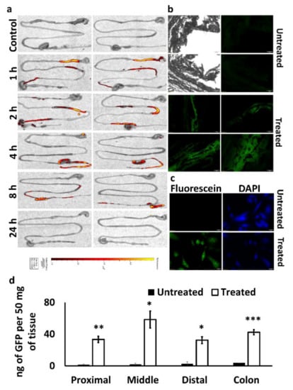 In comparison to the respective sections from the untreated mice, the treated mice had (50 mg of intestinal tissue per mouse per group): (a) 33 ng vs. 1.6 ng of GFP protein (Proximal); (b) 58.4 ng vs. 1.9 ng of GFP protein (Middle); (c) 32.4 ng vs. 2.8 ng of GFP protein (Distal), and (d) 42.5 ng vs. 3.8 ng of GFP (colon). (Figure 9d). These data indicate that the plasmid transfection due to the 5-day oral administration of the PEG-PCL NPs induces relatively homogenous gene expression to the intestinal tissues, with the strongest expressions taking place at the middle portion of the small intestine and the colon.