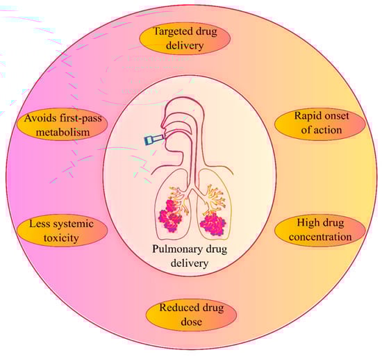 The inhalation delivery of drugs is one of the important routes of drug administration for the treatment of respiratory disorders from ancient times [11,27,28]. Today, the inhalation route is the most preferred route of administration for the treatment of many pulmonary conditions such as asthma, chronic obstructive pulmonary disease (COPD), cystic fibrosis, pneumonia, etc. The human lungs’ surface area is large and has a highly permeable epithelium, making it easily accessed by an inhaled dose [8,29]. The pulmonary route (Figure 1) is considered a targeted lung delivery since it offers the administration of a drug directly to its site of action, resulting in a rapid onset of activity with smaller administered doses and higher concentrations delivered locally to the lungs’ disease site. Furthermore, minimizing systemic bioavailability reduces the potential incidence of adverse systemic toxicities and avoids the first-pass metabolism in the liver [8,30,31].