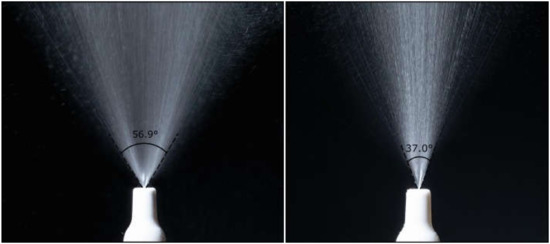 Spray cone angles of in situ gelling fluticasone (0.05%, w/w) suspensions prepared with (left) pectin (0.5%, w/w) and (right) pectin and gellan gum (0.5% and 0.2%, w/w, respectively). Reproduced with permission from [74], Elsevier, 2019.