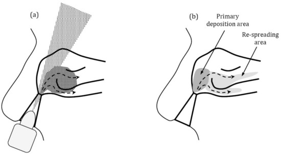 The association between the inspiratory airflow and aerosol deposition patterns in the nose is a debatable point. While some studies have concluded that there is no or only scant effect of the breathing profile on deposition [59,63,76], others showed deeper deposition beyond the nasal valve by increasing the flow rate [74,75]. Foo et al. confirmed that by tuning the spray plumes and administration angles, they could achieve mass deposition up to 90% in the three (physiological) turbinate regions, and increasing the inspiratory airflow to 60 L/min caused no change in turbinate localization [63]. However, Sosnowski et al. showed that adjunct airflow improved nasal drug transport by 2–3 cm towards the nasopharynx [62], but the authors considered that secondary spreading occurred as a result of active displacement of already-deposited drug layers covering the nasal surface was a more reasonable explanation for the enhanced drug transport, as illustrated in Figure 6. Such a phenomenon has great importance in the paediatric narrow nasal airways investigated by Sosnowski et al. [62]. Nižić et al. reported that the dry powder nasal deposition and recovery efficiency were decreased upon applying 20 L/min inspiratory airflow, which could be due to carrier/microsphere de-agglomeration associated with the assisting airflow, producing smaller particles that can easily leave the nasal cavity [60].