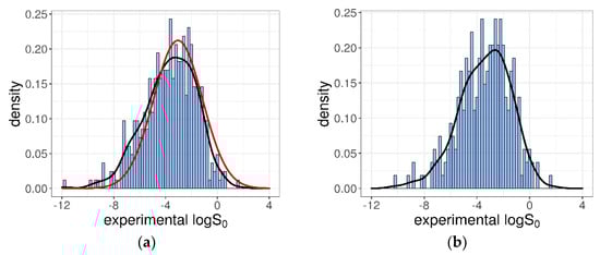 The 412 intrinsic solubility values ranged from −11.76 to +1.7 log molarity, with about 53% of them falling between −7 and −3 log unit, which corresponded to the typical range for drugs and research compounds [35]. The logS0 distribution was essentially a Gaussian characterized by a mean = −3.66, a median = −3.52, and a SD = 2.02 log unit. In Figure 1a, the obtained distribution is shown and compared with the distribution of the logS0 values collected in the Wiki-pS0 database [12]. From this, it is evident that, even if the number of solubility entries was significantly lower (412 vs. 6355), our dataset was representative of the more comprehensive Wiki-pS0 database, at least in terms of logS0 values. However, because the whole collection of Wiki-pS0 molecules is not publicly available, the similarity in the “chemical feature space” with our training dataset cannot be evaluated.