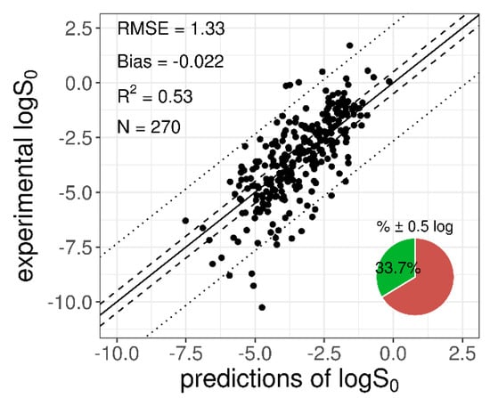 Experimental measurement of S0 is not an easy task to perform, and several factors, such as temperature, physical form of the precipitate, solution pH, and ionization state, as well as the presence of different tautomeric forms (which may have different physico-chemical properties) in equilibrium in the solutes, can contribute to its variability [36,37]. As a result, while taking care to select reliable sources for solubility data, unidentified errors due to mistakes and variability in the experimental methodologies would be undoubtedly introduced. For a significant number of drug-like molecules, inconsistent intrinsic solubility values are reported in the literature. Despite Adveef determining the average inter-laboratory reproducibility of 870 molecules from the Wiki-pS0 database as 0.17 log unit [12], different studies in the literature and our findings suggested that the typical error of reported intrinsic solubilities of drug-like molecules is around 0.6–0.7 log unit [8,9,10,11]. Because the accuracy of a model cannot exceed the accuracy of the experimental data, this implies that the best realistically possible predictor would achieve an RMSE similar to the inter-laboratory standard deviation of logS0 data; i.e., around 0.6–0.7 log unit.