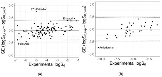 Plots of the SE versus experimental logS0 for the 100-compound low-variance tight set (a) and the 32-compound high-variance loose set (b) provided by the SC-2. Dotted lines mark the cut-off threshold for outliers equal to 2×RMSE (test 1: 2.32 log unit; test 2: 2.48 log unit). Names of outlier compounds are displayed.