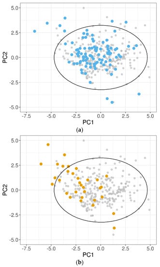 A PCA on the 10 normalized descriptors (Table 2) was performed for the training dataset, and the test sets were projected on the obtained PCs. In Figure 5, the 100-compound test set 1 (panel (a)) and the 32-compound test set 2 (panel (b)) were plotted in the two-dimensional space defined by PC1 and PC2 of the training dataset, which accounted for 53% of the total variance. It was evident that for both the test datasets, some compounds fell outside the 95% CI ellipse that identified the DOA. In addition, several test set 2 molecules, although inside the 95% CI ellipse, were placed in poorly representative areas of the training domain.