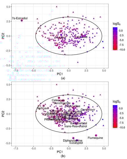 (a) Projection of the three worst-predicted outliers of test set 1 in the PC1–PC2 dimensional space. (b) Projection of the 22 best-predicted compounds of test set 1 in the PC1–PC2 dimensional space. Circles mark the test compounds; triangles represent the 270 training molecules; and the black solid ellipse marks the 95% CI of the training domain. For both training and test compounds, solubility value is represented by color.