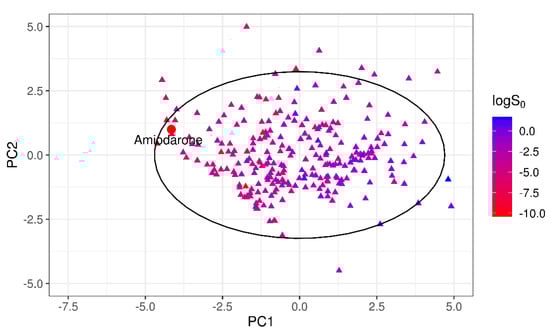 The same DOA assessment was performed for the 32-compound test set 2. Figure 7 shows the position of the worst-predicted compound, amiodarone, in the PC1–PC2 plane.