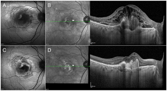 Clinical efficacy of anti-VEGF injections in macular neovascularization secondary to age-related macular degeneration. The onset of the neovascularization is characterized by evident changes of the fundus autofluorescence signal (A). Structural OCT describes a completely altered macular profile, with the presence of wide subretinal and intraretinal exudation (B). After the loading dose of three-monthly intravitreal injections of anti-VEGF, it is possible to observe an improvement of the fundus autofluorescence profile (C), together with the complete regression of the exudation detected by structural OCT (D).