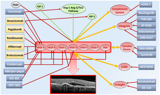 Summary diagram showing present and experimental molecular targets and corresponding intravitreal drugs for exudative age-related macular degeneration (AMD). The upregulation of vascular endothelial grow factor (VEGF) family expression, made by VEGF-A, VEGF-B, VEGF-C, VEGF-D, VEGF-E, VEGF-F and PGF, is responsible for the onset and progression of macular neovascularization and fluid production in exudative AMD. All VEGF molecule subtypes bind to different types of VEGF tyrosine kinase trans-membrane receptors. VEGF family production and release is further stimulated by increased levels of angiotensin 1-2 (Ang-1-Ang-2)/Tie2 pathway, insulin-like growth factor 1 (IGF-1) and hypoxia inducible factor-1 (HIF-1) (green arrows). Furthermore, a natural VEGF inhibitor is represented by PEDF (red arrow), resulting dysregulated in exudative AMD. Currently, approved anti-VEGF molecules include bevacizumab, pegaptanib, ranibizumab, aflibercept and brolucizumab. Although most of current anti-VEGF drugs mainly bind VEGF-A isoforms (red arrows), bevacizumab shows mild affinity also for HIF-1, while aflibercept also binds PGF. Anti-VEGF molecules under investigation include faricimab (VEGF-A isoforms + Ang-1-Ang-2/Tie2 pathway), conbercept (VEGF-A + VEGF-B + VEGF-C isoforms), abicipar-pegol (VEGF-A isoforms), KSI-301 (VEGF-A isoforms) and OPT-302 (VEGF-C + VEGF-D isoforms). Exudative AMD is also characterized by upregulation of complement system, integrins, tyrosine kinase, eotaxin C-C chemokine receptor type 3 (CCR3) and endoglin, which contribute to the increased production and release of VEGF family and often are themselves stimulated by the increased level of VEGF isoforms (orange arrows). Several molecules are currently under investigation through multicenter clinical trials, targeting these cofactors of the neovascular process, including complement system inhibitors (ICON-1), integrins inhibitors (risuteganib, THR-687, SF-0166, volociximab, JSM-6427), tyrosine kinase inhibitors (PAN-0806, sunitinib), CCR3 inhibitors (AKST4290) and endoglin inhibitors (carotuximab, DE-122).