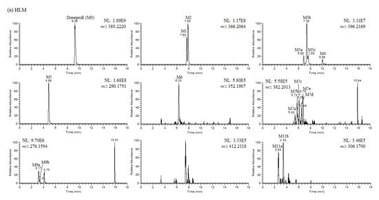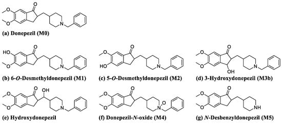 The following are available online at https://www.mdpi.com/article/10.3390/pharmaceutics13070936/s1, Figure S1: (a) Representative product ion scan mass spectra of donepezil (M0) and (b–v) metabolites of donepezil (M1–M11), and their proposed fragmentation scheme. The information on each metabolite is given in Table 1, Figure S2: (a) Representative extracted ion chromatograms and (b) product ion scan mass spectrum of N-desbenzyldonepezil (M5) authentic standard.