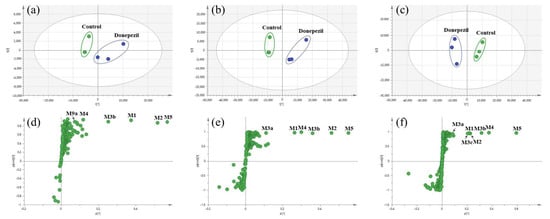 Multivariate analysis of donepezil metabolites in human liver microsomes (HLM) (a), mouse liver microsomes (MLM) (b), and rat liver microsomes (RLM) (c). Control groups were incubated in the absence of nicotineamide adenine dinucleotide phosphate reduced form (NADPH), and donepezil groups were incubated in the presence of NADPH. Score plots were generated by a principal component analysis based on the liquid chromatography–high resolution mass spectrometry data of human liver microsomes (HLM) (a), mouse liver microsomes (MLM) (b), and rat liver microsomes (RLM) (c). Loading S−plots were generated by an orthogonal partial least square−discriminant analysis (OPLS−DA) based on the liquid chromatography–high resolution mass spectrometry data of HLM (d), MLM (e), and RLM (f). The p [1] values represent the relevant abundance of ions, and p(corr) [1] values represent the interclass difference. Green dots on the S−plot represent variables (mass spectral data) which reflect the influence of each variable in the two groups (control vs. donepezil). Variables that are farthest from the origin in the S−plot are selected as potential donepezil metabolites. Identified metabolites were marked with abbreviations on the S−plot, and metabolite lists are given in Table 1. Data processing and model construction are described in the Materials and Methods.