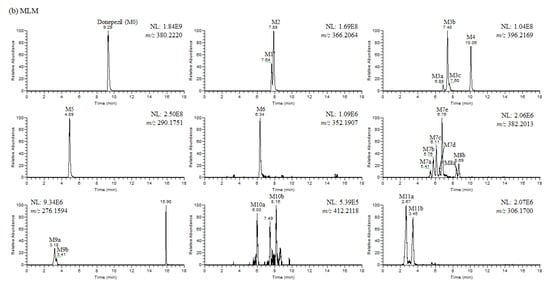 In this study, the in vitro metabolism of donepezil by HLM, MLM, and RLM was examined using a non-targeted metabolomics approach combined with molecular networking using LC-MS/MS. The structure of the metabolites was characterized based on accurate mass and fragmentation patterns. A total of 21 donepezil metabolites (17 metabolites in HLM, 21 metabolites in MLM, and 17 metabolites in RLM) were detected, including those previously reported. A total of 14 Metabolites (M3a, M3b, M7a, M7b, M7d, M7e, M8a, M8b, M9a, M9b, M10a, M10b, M11a, and M11b) were newly identified. Donepezil was metabolized in various ways after incubation with liver microsomes. The results showed that metabolites are formed through four major metabolic pathways. (1) O-demethylation, (2) hydroxylation, (3) N-oxidation, and (4) N-debenzylation. Twenty-one Phase I donepezil metabolites in addition to one potential reactive metabolite were detected, and the position of the metabolic reaction is proposed in Figure 7. The proposed metabolic pathway is also depicted in Figure 8. One potential reactive metabolite (cyano adduct) was observed in rat liver microsomal incubation samples for the first time.