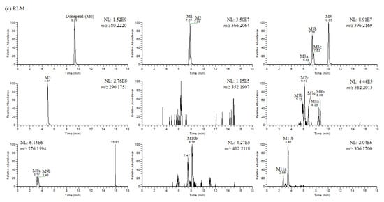 (a) Representative extracted ion chromatograms of donepezil and its metabolites obtained from the liquid chromatography–high resolution mass spectrometry analysis of human liver microsomes (HLM) incubation mixtures of donepezil in the presence of nicotineamide adenine dinucleotide phosphate reduced form (1 h, 37 °C). NL stands for normalization level, which describes the intensity of the highest peak in each chromatogram. (b) Representative extracted ion chromatograms of donepezil and its metabolites obtained from the liquid chromatography–high resolution mass spectrometry analysis of mouse liver microsomes (MLM) incubation mixtures of donepezil in the presence of nicotineamide adenine dinucleotide phosphate reduced form (1 h, 37 °C). NL stands for normalization level, which describes the intensity of the highest peak in each chromatogram. (c) Representative extracted ion chromatograms of donepezil and its metabolites obtained from the liquid chromatography–high resolution mass spectrometry analysis of rat liver microsomes (RLM) incubation mixtures of donepezil in the presence of nicotineamide adenine dinucleotide phosphate reduced form (1 h, 37 °C). NL stands for normalization level, which describes the intensity of the highest peak in each chromatogram.