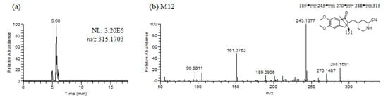 The metabolite M4 exhibited a protonated molecular ion [M+H]+ at m/z 396.2170 and gave a characteristic fragment ion at m/z 288.1592, 243.1389, 151.0752, and 91.0547, indicating that oxidation may occur at the nitrogen atom of the piperidine ring. This was confirmed by co-chromatography and the MS/MS spectral data of the authentic standards (Figure S1g). Characteristic fragment ions of donepezil N-oxide at m/z 91.1, 151.1, 243.1, and 288.2 were also reported in previous studies [35,37]. Metabolite M4 had a longer retention time compared with that of the parent drug, which is characteristic of N-oxide metabolite reported for several drugs [7,39].