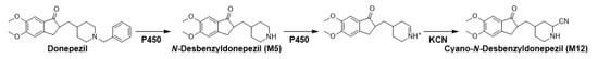 The production of reactive metabolites is believed to be a major mechanism for the side effects of drugs, especially idiosyncratic drug-induced liver injury (DILI) [43,44]. Although infrequent liver injury related to donepezil has been reported post-marketing, the mechanism of toxicity is not yet well understood. As previously reported, alicyclic amines are oxidized by cytochrome P450 and other drug-metabolizing enzymes to iminium ions [45,46]. Furthermore, iminium ions are strong nucleophiles that can be covalently bonded to proteins or deoxyribonucleic acid bases and are known to mediate many toxicities [47,48]. These reactive iminium intermediates may be associated with the reported side effects of donepezil. However, reactive metabolite formation does not necessarily trigger hepatotoxicity; therefore, to account for the role of these potential reactive metabolites, the relationship between donepezil’s reactive metabolites and donepezil-induced hepatotoxicity should be further evaluated.