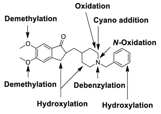 - Matsui, K.; Mishima, M.; Nagai, Y.; Yuzuriha, T.; Yoshimura, T. Absorption, distribution, metabolism, and ex-cretion of donepezil (Aricept) after a single oral administration to Rat. Drug. Metab. Dispos. 1999, 27, 1406–1414. [Google Scholar] [PubMed]
